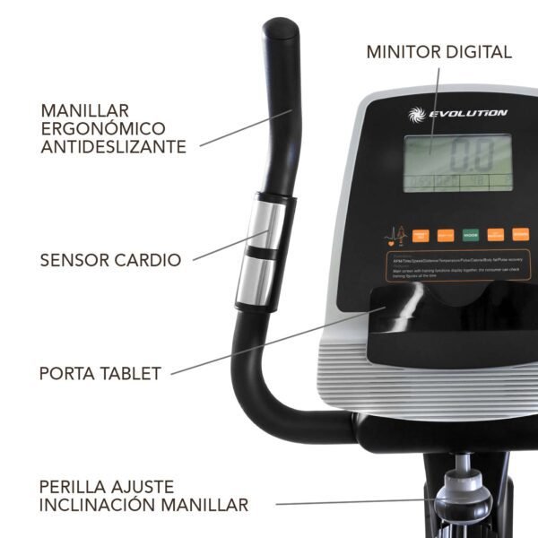 Consola: Rpm, tiempo, velocidad, distancia, temperatura, pulso, calorías, grasa corporal, recuperación de pulso